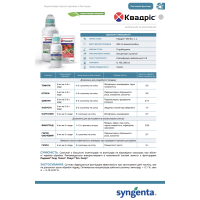 Квадріс® — новий унікальний фунгіцид із нового класу препаратів — стробілуринів. Має системну, профілактичну лікувальну, викорінювальну дію і трансламінарну властивість. Лікувальна дія — 2 доби, що дозволяє знищити збудника хвороби під час інкубаційного періоду. Викорінювальна дія дозволяє зупинити поширення інфекції й розвиток хвороби на ділянці. Єдиний препарат, який захищає овочеві культури від усіх основних хвороб: борошнистої роси, фітофторозу, макроспоріозу, несправжньої борошнистої роси, плямистостей та ін. Квадріс® не тільки дозволяє захистити і вилікувати рослини, а й подовжує на 2–3 тижні плодоношення культур. Застосування в період збирання овочів суттєво покращує їх зберігання у сховищах і домашніх умовах. Препарат належить до малотоксичних (ЛД50>2000 мг/кг). Нетоксичний для бджіл, безпечний для користувача й довкілля. Тривалість захисної дії — 12–14 днів.