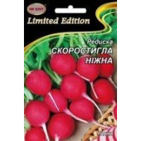 Редиска Скоростигла ніжна--Ранньостиглий сорт. Вегетаційний період від сходів до технічної стиглості - 25-27дней. Коренеплід округлої форми, інтенсивно-червоного кольору, діаметром 3-4 см, масою 15-30г, повністю заглиблений в грунт. М“якоть біло-рожева, щільна, ніжна, слабо гострого смаку. Сорт цінується за ранню і одночасну віддачу врожаю. Вирощується у відкритому ґрунті і плівкових теплицях.