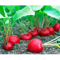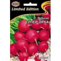 Редиска Супер зірка--Ранньостиглий сорт. Вегетаційний період від сходів до технічної стиглості - 25-27дней. Коренеплід округлої форми, інтенсивно-червоного кольору, діаметром 3-4 см, масою 15-30г, повністю заглиблений в грунт. М“якоть біло-рожева, щільна, ніжна, слабо гострого смаку. Сорт цінується за ранню і одночасну віддачу врожаю. Вирощується у відкритому ґрунті і плівкових теплицях.Вага:20г