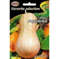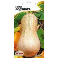 Гарбуз Родзинка-- Середньопізній - 120-125 днів. Лежкий сорт мускатного типу, з високим вмістом каротину. Плоди насиченого оранжевого кольору, циліндричної форми з потовщеними біля основи. М“якоть помаранчевого кольору, щільний з чудовим солодким смаком. Середня маса плодів 3-4кг. Транспортабельний. Плоди довго зберігаються. Стійкий до захворювань. Призначений для приготування соків і пюре, різних типів каші. Рослина вимоглива до тепла.