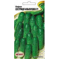 Огірок Сестриця Альонушка-- Чудовий середньоранній бджолозапильний гібрид. Період від сходів до першого збору плодів - 45-50 днів. Призначений для відкритого грунту і плівкових теплиць. Рослини потужні, переважно жіночого типу цвітіння. Зеленці циліндричні, горбкуваті, білошипі, масою 80-100г, довго не жовтіють. Смак відмінний, огірочки хрусткі, соковиті, без гіркоти. Мають високі засолювальні якості, підходять для консервації і свіжого споживання.