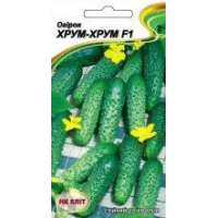 Огірок Хрум - Хрум F1--Середньоранній -43-48днів. Бджолозапильний гібрид, для вирощування у відкритому ґрунті і під тимчасовими плівковими укриттями. Рослина середньоросла, жіночого типу цвітіння. Зеленець короткий, циліндричний, велико бугорчатий з чорним опушенням. Маса зеленця 95-105г. Чудово підходить для засолювання і маринування, не утворює пустот. Плоди мають неперевершений смак і аромат. Рослинам потрібен полив, прополка, розпушування та підживлення.