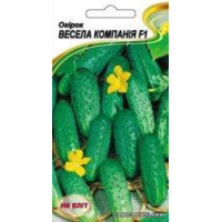 Огірок Весела компанія F1 /партенокарпік/--Ранньостиглий від масових сходів до першого збору плодів – 44-48 днів. Партенокарпічний гібрид консервного призначення. Рослина переважно жіночого типу цвітіння, коротко плетиста. Плід короткий, корнішонного типу, бугорчатий, біло-опушений, циліндричної форми, зелений, довжиною 11-12см. Стійкий до хвороб. Плоди використовують для консервування і у свіжому вигляді.