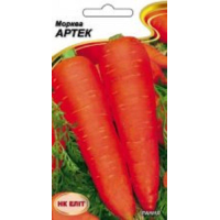 Морква Артек--Середньостиглий - 65-85 днів. До пучкової продукції 52 дні. Коренеплід оранжево-червоний, конічної форми, з тупим кінцем, довжиною 15 см, діаметром 4 див. Врожайність 4,2-6,7 кг / м2. Маса коренеплоду 72-130 р. Смакові якості відмінні. Використовують у свіжому вигляді і для переробки.Вага: 2г-------------------------------------------------------------------------Морква-холодостійка рослина. Насіння її проростає при температурі 2-3 ° С, сходи витримують зниження її до -5 ° С Температурний фактор значно впливає на прискорення або гальмування процесів росту і розвитку. Так, при температурі + 8 ° С насіння проростає через 25-30 днів, тоді як при 18-20 ° С - через 7-8. Формування і наростання коренеплодів краще відбувається при температурі 18-20, гички - 22-25 ° С, При більш високій температурі приріст їх сповільнюється, а при 35 ° С припиняється. Коренеплоди при цьому дерев“яніють і набувають неприємного присмаку. У моркви часто трапляються відхилення від дворічного циклу розвитку - рослини утворюють стебло і зацвітають в рік посіву. Особливо багато цвітухи з“являється після тривалого зниження температури після посіву.Морква порівняно з іншими овочевими культурами менш вимоглива до світла, тому її часто вирощують у садах і як подпокровных культуру (підсівають під ярі зернові, льон). Однак для нормального росту і розвитку вона потребує достатнього освітлення, особливо під час появи сходів. Погане освітлення в даний час є причиною витягування і пригнічення рослин, в результаті чого запізнюється і сповільнюється формування коренеплодів. При Вирощування моркви в умовах затінення погіршується хімічний склад коренеплодів. Слід зазначити, що різновиди моркви, які походять з різних географічних широт, неоднаково реагують на тривалість дня. У перший рік життя вони нормально ростуть навіть при цілодобовому освітленні і зберігають дворічний цикл розвитку.Коренеплоди моркви містять до 84-88% води. Тому нормальний їх приріст можливий тільки при достатній вологості грунту. При дефіциті вологи рослини ростуть слабо, коренеплоди грубіють, дерев“яніють, набувають гіркуватий присмак. При затопленні водою ріст рослин припиняється і вони гинуть. Критичним для моркви періодом водозабезпечення є час від посіву до появи сходів, найбільшого розвитку листя і приросту коренеплодів. При несвоєчасному зволоженні грунту, особливо після короткочасних посух в період інтенсивного приросту спостерігається масове розтріскування коренеплодів, яке призводить до зниження товарності.Морква краще росте і розвивається на легких і суглинних ґрунтах, а також на торфовищах, гірше - на важких глинистих, з неглибоким орним шаром. При вирощуванні на добре розроблених грунтах виходять коренеплоди правильної форми, з характерними для сорту ознаками. На погано розроблених, ущільнених і перезволожених землях багато коренеплодів мають потворну форму і загнивають. Збільшується їх розгалуження, коли під моркву вносять свіжий соломистий гній. Морква, вирощена при і внесення підвищених норм азотних добрив, гірше зберігається взимку. У сівозміні культуру розміщують після озимих зернових, що вирощуються на зерно і зелену масу, при необхідності - і після овочевих культур, які рано звільняють поле. Для збагачення грунту органічними речовинами. Після збирання попередника краще вирощувати проміжну культуру (вико-овес,
