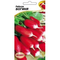 Редиска Богиня--Ранньостиглий - 22-25 днів. Коренеплід удлиннено-овальний, рожево-червоний з білим кінчиком, масою 18-30 м, наполовину заглиблений у ґрунт. М“якуш соковитий, білий, ніжний, слабо гострий, багата вітамінами і мінеральними солями. Урожайність 1,5-2,3 кг/м2. Використовують у свіжому вигляді. Вага: 3г-------------------------------------------------------------------------------------Технологія вирощування редьки По скороспілості розрізняють літню і зимову редьку. Річна належить до однорічних культур, сорти її мають короткий період вегетації (40-50 днів), коренеплоди споживають влітку. Редька зимова - дворічна культура. Сорти її мають тривалий період вегетації (85-100 днів), коренеплоди використовують восени, взимку і навесні. Редьку широко використовують як компонент багатьох страв, особливо для приготування салатів. Редьку летнюю высевают рано весной. Способ сева - широкорядный (30-45 см), широкополосный (ширина междурядий 45 см, полосы - 5-12 см) или ленточный (30 + 15 + 15 + 15, 45 + 15 + 15 + 15 см). Норма высева семян при широкорядном способа сева составляет 0,4-0,6 г / м.кв, по широкополосного и ленточного - 0,6-1,0 г / м.кв.Семена заделывают на глубину 0,5-1,5 см. После посева почву уплотняют. Уход за растениями такой же, как за редиской. Особенностью выращивания является то, что в строках и полосах растения прорывают на расстоянии 4-5 см и в период выращивания междурядья 2-3 раза рыхлят. Урожай редьки збирають в один або два прийоми, коли діаметр коренеплодів досягне 3-5 див Відразу після вибору на них обрізують листки, довгі корінці, сортують на товарні і нетоварні. Перші використовують за призначенням. Коренеплоди редьки літньої зберігаються краще, ніж редиски. Редьку зимову в умовах України, як правило, висівають як повторну і післязбиральної культуру. Оптимальний строк сівби насіння - кінець червня - перша половина, а в південних областях - і друга половина липня.Спосіб сівби - широкорядний (30-45 см), широкосмуговий (ширина міжрядь 45 см, смуги - 5-12 см) або стрічковий (20 + 50 см). Норма висіву насіння - 0,4-0,5 г / м. кв., Глибина загортання - 2-3 см (залежно від вологості ґрунту). До і після сівби ґрунт ущільнюють.Догляд за рослинами такий самий, як за редькою літньою. Особливістю є те, що рослини проривають у рядку на відстані 6-8 см. протягом періоду вирощування міжряддя 4-5 разів розпушують. Рослини, які стрілкою, під час утворення стебел видаляють. У південних районах посіви 4-5 разів поливають. Урожай редьки зимової збирають пізно восени до настання приморозків. Після вибору рослин з грунту листки і довгі корінці обрізають. Зберігають коренеплоди так само, як і буряк столовий.