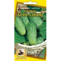 Огірок Бригадний--Ранньостиглий - 43-46 днів. Рослина сильноросла. Зеленець овально-циліндричної форми, з чорними шипами. Довжина плоду 9-13см, діаметр 3,5-4см, забарвлення плоду зеленае зі світлими смужками. М“якоть щільна, хрустка. Урожайність 1,5-2,5 кг/м2. Стійкий до борошнистої роси. Для засолювання і консервування