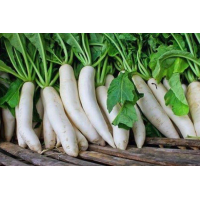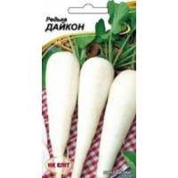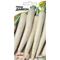 Редька Дайкон--Середньостиглий - 70-100 днів. Коренеплід білий, зі світло-зеленою пігментацією, подовжено-циліндричної форми, наполовину заглиблений у грунт, довжиною 22-35 див. Маса 100-400 р. М“якоть біла, ніжна, щільна, дуже соковита. Врожайність 5-7 кг/м2. Використовують у свіжому, вареному, консервованому вигляді.Вага: 2г------------------------------------------------------------------------------Технологія вирощування редьки По скороспілості розрізняють літню і зимову редьку. Річна належить до однорічних культур, сорти її мають короткий період вегетації (40-50 днів), коренеплоди споживають влітку. Редька зимова - дворічна культура. Сорти її мають тривалий період вегетації (85-100 днів), коренеплоди використовують восени, взимку і навесні. Редьку широко використовують як компонент багатьох страв, особливо для приготування салатів. Редьку літню висівають рано навесні. Спосіб сівби - широкорядний (30-45 см), широкосмуговий (ширина міжрядь 45 см, смуги - 5-12 см) або стрічковий (30 + 15 + 15 + 15, 45 + 15 + 15 + 15 см). Норма висіву насіння при широкорядному способу сівби становить 0,4-0,6 г / м. кв, по широкосмугового і стрічкового - 0,6-1,0 г / м. кв.Насіння загортають на глибину 0,5-1,5 см Після сівби ґрунт ущільнюють. Догляд за рослинами такий самий, як за редискою. Особливістю вирощування є те, що в рядках і смугах рослини проривають на відстані 4-5 см і в період вирощування міжряддя 2-3 рази розпушують. Урожай редьки збирають в один або два прийоми, коли діаметр коренеплодів досягне 3-5 див Відразу після вибору на них обрізують листки, довгі корінці, сортують на товарні і нетоварні. Перші використовують за призначенням. Коренеплоди редьки літньої зберігаються краще, ніж редиски. Редьку зимову в умовах України, як правило, висівають як повторну і післязбиральної культуру. Оптимальний строк сівби насіння - кінець червня - перша половина, а в південних областях - і друга половина липня.Спосіб сівби - широкорядний (30-45 см), широкосмуговий (ширина міжрядь 45 см, смуги - 5-12 см) або стрічковий (20 + 50 см). Норма висіву насіння - 0,4-0,5 г / м. кв., Глибина загортання - 2-3 см (залежно від вологості ґрунту). До і після сівби ґрунт ущільнюють.Догляд за рослинами такий самий, як за редькою літньою. Особливістю є те, що рослини проривають у рядку на відстані 6-8 см. протягом періоду вирощування міжряддя 4-5 разів розпушують. Рослини, які стрілкою, під час утворення стебел видаляють. У південних районах посіви 4-5 разів поливають. Урожай редьки зимней собирают поздней осенью до наступления заморозков. После выбора растений из почвы листья и длинные корешки обрезают. Хранят корнеплоды так же, как и свекла столовая