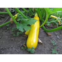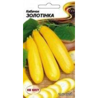 Кабачок Золотинка--Ранньостиглий - 45-50 днів. Рослина кущова. Плід цилиндрично-овальний форми, золотисто-жовтого кольору. М“якуш світло-жовтого кольору з ніжним солодким смаком. Врожайність 4-8 кг/ м2. Використовують для переробки і консервування. Збір врожаю до перших заморозків. Золотистий колір плодів при консервуванні зберігається. Вага: 20 шт-------------------------------------------------------------------------------------Агротехніка.Під кабачки і патисони слід відводити ділянки з добре прогріваються, родючим грунтом. Надмірно вологі торф“яні та важкі глинисті грунти для них непридатні. Кислотність грунту повинна бути в межах рН 6-6,5.Грунт під кабачки копають восени після збирання попередньої культури на повну глибину перегнойного шару. Навесні ґрунт вирівнюють граблями, знищують бур“яни, а у другій половині травня під перекопування вносять гній або компост (1 -1,5 відра на 1 м2) і мінеральні добрива (15 г сечовини, 40 г суперфосфату і 20 г хлористого калію на 1 м ). У південних районах кабачки і патисони вирощують у відкритому грунті посівом насіння в грунт. У кліматичних умовах Нечорноземної зони кабачки, посіяні у відкритий ґрунт, або не дають врожаю, або він буває настільки низьким, що не виправдовує витрат, пов“язаних з їх вирощуванням. Тому для отримання задовільного врожаю кабачків і патисонів краще застосовувати горшечную розсаду. До моменту посадки (5-15 червня) розсаду з 2-3 добре розвиненим листям садять за схемою 1 X 1 м. При посадці в лунку стежать за тим, щоб горщики були щільно обтиснуті грунтом і опущені на 2-3 см нижче її поверхні. Високу ефективність одержують при внесенні в лунки перед посадкою органоминеральной суміші наступного складу: 0,5 відра перегною або компосту, 5 г сечовини, 20 г суперфосфату і 10 г хлористого калію. Посадку кабачків необхідно проводити з поливом, вносячи 1-2 л коди під одну рослину.Догляд за кабачками і патиссонами полягає в розпушуванні грунту навколо рослин, прополках, підгодівлях, поливах та боротьбі з шкідниками і хворобами.Урожай кабачків починають прибирати по досягненні споживчої стиглості плодів, тобто коли вони будуть довжиною 15-20 см і діаметром 5-7 див Таких розмірів плоди досягають через 8-12 днів після зав“язування. В цей час плодоніжка соковита, неогрубевшая і плоди при збиранні легко зрізаються ножем. При масовому зав“язуванні плодів і сприятливих зовнішніх умов відбувається швидкий їх ріст. В цей період необхідно збирати кабачки щодня, не допускаючи їх переростання. Плоди патисонів для цільноплідного консервування, маринування та соління прибирають у віці 3-5 днів після зав“язування, по досягненні розміру 5-7 см в діаметрі, масою 35-70 р.