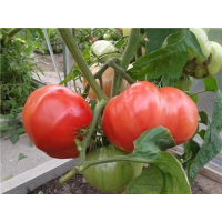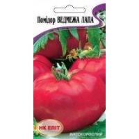 Томат Ведмежа лапа--Середньоранній - 105-110 днів. Кущ високорослий, висотою 120-170 см, прямостояче. Плоди округло-плескаті, яскраво-червоні, гладкі, масою до 800г. Смак свіжих і консервованих плодів 4,5 балів. Врожайність 7,3-7,9 кг / м2. Мало уражується фітофторою. Використовується у свіжому вигляді.Вага:0,1 г ------------------------------------------------------------------------------------Томат (Lycopersicon esculentum Mill.) - однорічна трав“яниста рослина родини пасльонових. Стебло або вилягає, або прямостоячі (у штамбових сортів), дуже гіллясте, покрите залозистими волокнами, які виділяють смолиста речовина зеленовано-жовтого кольору зі специфічним запахом. На головному стеблі в пазухах листя виростають бокові пагони (пасинки). У низькорослих (детермінантних з обмеженим ростом) сортів перша квіткова кисть закладається над п“ятим-шостим листом, а наступні кисті - через один-два аркуша. Тому ці сорти відрізняються більшою скоростиглістю та дружнім плодоносінням і дозріванням. У високорослих (індетермінантних) сортів перша квіткова кисть закладається над сьомим-дев“ятим листком, а наступні - через два-три аркуші. Це пізньостиглі, з розтягнутим плодоношенням сорту.Квітки в томату двостатеві, з п“ятьма-шістьма пелюстками і такою ж кількістю тичинок, з“єднаних в конусоподібний стовпчик, всередині якого знаходиться маточка. Томат в основному самозапильник, але в довготичинкових квіток можливо і перехресне запилення (на півдні - з допомогою трипсів). Суцвіття поділяються на прості і розгалужені.Плоди відрізняються за розміром, формою, забарвленням і кількістю камер, тобто за кількістю насіннєвих гнізд (камер). Чим менше розмір камер і товщі їх стінки, тим більше м“ясистість плодів. Дрібноплідні сорти зазвичай мають мало камер, і у них більше насіння; великоплідні - багатокамерні з меншою кількістю насіння. Насіння жовтувато-сірі, опушені, плоско-округлі. Маса 1000 насіння 2,5-4 г (200-250 шт. В 1 г).Коренева система томату міститься в основному в орному шарі ґрунту, окремі корені проникають вглиб і в сторони до 2 м. видалення бічних пагонів (пасинків) і, отже, при скороченні асиміляційного апарату значно зменшується і потужність кореневої системи. При розсадної культури основна маса коренів не проникає глибше 40-50 см і поширюється в радіусі до 60 див. Придаткові коріння легко утворюються при тривалому контакті стебел з вологим грунтом. При безрассадной культурі зберігається стрижневий корінь, занурений в грунт, і зростає глибина проникнення кореневої системи. Різницю в формуванни кореневои системи і стійкості рослин при несприятливих умовах необхідно враховувати при виборі способів вирощування томатів.Томат - теплолюбна культура. Його насіння проростає при температурі не нижче 11 ° СПри температурі нижче 15 ° С припиняється цвітіння, а при 10 ° С припиняється і при мінус 0,5 ° С гинуть квітки, а при -1 ° С відмирають листя і стебла. Однак холодостійкі при наливанні плодів вони уражаються верхової гниллю. При різкій зміні посушливого періоду на вологий плоди розтріскуються.Оптимальна вологість ґрунту для томата знаходиться в межах 70-80% НВ, завис від фази розвитку рослин.Критичним при необхідності рослини у воді є період утворення бутонів і зав“язей, коли нестача вологи призводить до їх опадання. Надлишок вологи, як і різке зниження температури під час цвітіння, призводять до осипання квіток, у періо