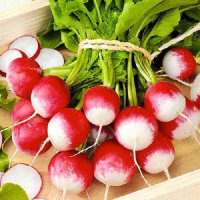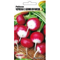 Редиска Червона з білим кінчиком--Ранньостиглий – 23-25 днів. Широко відомий сорт. Коренеплід округло-овальний, червоний з білим кінчиком, масою 20-30 р. М“якоть соковита, біла, слабо гострий. Урожайність 1,3-2,2 кг/м2. Стійкий до цвітухи. Вирощують у відкритому ґрунті і під плівкою. Використовують у свіжому вигляді.
