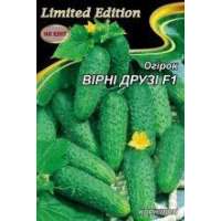Огірок Вірні друзі--Ранньостиглий – 37-39дней від сходів. Бджолозапильний гібрид жіночого типу цвітіння з пучковим розташуванням зав“язей у вузлах. Плоди корнішонного типу, овально-циліндричної форми, довжиною 8-10см, зеленого забарвлення. Гібрид відносно холодостійкий, стійкий до хвороб. Засолювальні якості дуже високі.