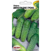 Огірок Виноградне гроно--Середньоранній – 45 – 50 днів. Високоврожайний сорт універсального призначення. Рослина сильно зростає, потужне, зі змішаним типом цвітіння. Плоди циліндричні, 12 – 14 см довжиною, інтенсивно – зелені, зі світлими смугами, соковиті, ніжні, солодкі, без гіркоти, з тонкою шкіркою, не жовтіють. Для вживання у свіжому вигляді та консервування. Вимагає щоденного збору.