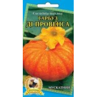 Гарбуз Ді Провенса мускатний--Пізньостиглий - 112-118 днів. Мускатний. Високоврожайний сорт з високим вмістом каротину. Плоди оранжевого кольору, округло-проплюснути, з ребристою поверхнею. М“якоть насиченого оранжевого кольору, щільний, з прекрасним смаком, дуже товстий. Середня маса плодів - 6кг. Плоди тривалий час зберігаються. Призначений для приготування соків і пюре, різних типів кашіВага: 10шт------------------------------------------------------------------------------------На городі гарбуз зазвичай розміщують уздовж паркану з південної сторони біля стін будівель. На попереднє місце повертають не раніше ніж через чотири роки. Кращими попередниками служать капуста, цибуля, картопля, коренеплоди і бобові культури. Можливо сусідство з огірками. Гарбуз висаджують рідко, тому органо-мінеральні добрива доцільно вносити прямо в лунку. На бідних грунтах у кожну лунку закладають органічні добрива (відро), суперфосфат (50 г) і золу (дві склянки), добре перемішуючи їх з верхнім шаром грунту на глибину 15-20 см. На глинистих ґрунтах додатково застосовують тирса (3-5 кг на лунку). Попередньо їх збагачують сечовиною (15 г на відро), нітрофоскою (стакан) і золою (літрова банка).Для посіву відбирають найбільш повновагі насіння і прогрівають їх 2-3 год при температурі 60 °С. Потім 2-3 сут їх пророщують у теплому приміщенні у вологих тирсі або мокрій ганчірці. Для підвищення холодостійкості насіння (особливо мускатного гарбуза) гартують. Зазвичай їх гартують так само, як і насіння огірків, але ефективно і проморожування. Для цього насіння кладуть у вологу ганчірку або тирса і на 2 добу поміщають у холодильник (0...2 °С).Гарбуз чуйна на всі види добрив і виносить засолення грунту до 0,7—1 %. Першу підгодівлю проводять через 7-10 діб після посадки або через три тижні після посіву. Для цієї мети використовують курячий послід, розведений водою, або гнойову рідоту (1 : 4). Часті підгодівлі (раз в тиждень) коров“яком або гнойової рідиною сприяють швидкому зростанню гарбуза і прискорюють її плодоношення. Відмінні результати одержують при додаванні в розчин мінеральної городньої суміші (40-50 г на 10 л води). Відро такого розчину витрачають на сім — десять рослин. Добре реагує гарбуз і на підживлення золою (склянка на 10 л води).Для кращого засвоєння перший раз добрива вносять в борозенки глибиною 6-8 см, зроблені навколо рослин на відстані 10-12 см. При подальших підгодівлі глибину борозенок збільшують до 10-12 см, а відстань від рослин — до 40 див. Після підгодівлі борозенки загортають землею. Прибирають гарбуз з 1 по 15 вересня (до настання заморозків) в суху погоду. Ознаками стиглості плодів служать всихання і опробковеніе плодоніжки, добре позначений малюнок кори та її затвердіння.