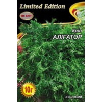 Кріп Алігатор---Середньостиглий, до товарного пучка - 40-45 днів. Кущового типу. Розетка листя стояча, велика, листя великі, забарвлення темно-зелені, пахучі, з сизим відтінком, з розсіченим сегментами. Урожайність зелені 1,3-2,6 кг / м2. Висівають рядковим способом і врозкид, з ранньої весни і до осені. Придатний для використання у свіжому, висушеному, солоному і замороженому вигляді.Вага: 10г-------------------------------------------------------------------- Кріп - рослина сімейства зонтичних, однорічна культура, скоростигла, холодостійка, світлолюбива, не вибаглива до умов вирощування. Перезволоження грунту не переносить. Рослини на верхівці трубчастого, сильно розгалуженого стебла утворюють розетку запашних сильнорозсичених на нитковидні частки листя, потім - суцвіття, в якому дозріває насіння. Всі частини рослини містять ароматичне масло. ° З, молоді рослини витримують заморозки до мінус 6 ° С. Оптимальною для розвитку рослини є температура 15-22 ° С. Сходи з“являються через 10-20 днів. Рослини спочатку формують листя на вкороченому стеблі, яке згодом збільшується з міжвузлів, а на верхівці формується сховане в плівчату пихвочку суцвіття. Це і є фаза господарської стиглості зелені кропу, коли рослини формують більше зеленої маси. В ній накопичено більше цінних речовин. С, А, В2, В6, Р, РР, білок, мінеральні солі, зокрема, калію, кальцію, фосфору, заліза, магнію; клітковину, екстрактивні речовини, жирні та ефірні олії. Завдяки багатому хімічному складу кріп - цінне харчове рослина: споживання 50 г кропу можна прирівняти до споживання 150 г помидорив.2. Для технічної продукції кріп сіють рядковим способом з міжряддями 20-25 см і нормою висіву 7-10 г / м2. При посіві сухими насінням сходи одержують через 15-20, а намоченными - через 5-10 днів. Намочують насіння за 2-3 доби до висіву на 4-5 годин, міняючи два-три рази воду. Після цього насіння підсушують до сипучого стану. Значно прискорює появу сходів і сприяє збільшенню врожаю барбатация (обробка киснем у воді) 2. На посівах технічного кропу міжряддя розпушують через кожні 7-10 днів до початку цвітіння. Подекуди насіння кропу при посіві змішують з насіння салату або редиски (0,3%), продукцію яких вже збирають при появі сходів кропу.2. ° З, при появі сходів її на 3-4 діб знижують до 10 ° С. Рослини за короткий час утворюють велику масу зелені (за 20-50 днів), тому виносять з грунту багато поживних речовин. Технічну продукцію в воскової стиглості насіння рослини формують через 38-85 днів після появи сходів. У першій фазі кріп потребує значної кількості азоту, у другій - калію і фосфору. Можна вирощувати кріп попередньої або післязбиральної культурі. У харчуванні зелень кропу використовують в салатах, на додаток до інших овочів, як приправу до супів, м“яса і риби, у соусах. Взимку використовують і насіння. Технічний кріп - парасольку з недостиглим насінням - використовують при солінні і маринуванні овочів. Кріп придатний також для ароматизації та вітамінізації сиру, масла, оцту. Із-за сильного своєрідний аромат його часто використовують самостійно, не комбінуючи з іншими прянощами. Зелень заготовляють на зиму, засаливая або висушуючи в тіні. Її ароматна та інші корисні властивості не втрачаються. Рослини кропу розміщують на структурних, легко, не перезволожених ґрунтах. Кращі попередники для нього - просапні культури, під які вносили органічні і мінеральні добр