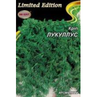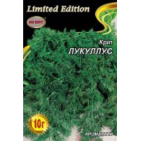 Кріп Лукуллус--Ранньостиглий - 30-35 днів до стеблеобразования. Цінність сорту: у листі підвищений вміст ефірних масел. Розетка листя стояча, листя з сильно розсічені сегментами, забарвлення темно-зелені з сизим відтінком. Настій з насіння використовують при хворобах печінки, судомах, при порушенні функцій органів травлення та ін .. Можна вирощувати з іншими овочами на вологих і родючих грунтах. Використовують у свіжому, замороженому вигляді та для консервуванняВага: 10г---------------------------------------------------------------------------------------- Кріп - рослина сімейства зонтичних, однорічна культура, скоростигла, холодостійка, світлолюбива, не вибаглива до умов вирощування. Перезволоження грунту не переносить. Рослини на верхівці трубчастого, сильно розгалуженого стебла утворюють розетку запашних сильнорозсичених на нитковидні частки листя, потім - суцвіття, в якому дозріває насіння. Всі частини рослини містять ароматичне масло. ° З, молоді рослини витримують заморозки до мінус 6 ° С. Оптимальною для розвитку рослини є температура 15-22 ° С. Сходи з“являються через 10-20 днів. Рослини спочатку формують листя на вкороченому стеблі, яке згодом збільшується з міжвузлів, а на верхівці формується сховане в плівчату пихвочку суцвіття. Це і є фаза господарської стиглості зелені кропу, коли рослини формують більше зеленої маси. В ній накопичено більше цінних речовин. С, А, В2, В6, Р, РР, білок, мінеральні солі, зокрема, калію, кальцію, фосфору, заліза, магнію; клітковину, екстрактивні речовини, жирні та ефірні олії. Завдяки багатому хімічному складу кріп - цінне харчове рослина: споживання 50 г кропу можна прирівняти до споживання 150 г помидорив.2. Для технічної продукції кріп сіють рядковим способом з міжряддями 20-25 см і нормою висіву 7-10 г / м2. При посіві сухими насінням сходи одержують через 15-20, а намоченными - через 5-10 днів. Намочують насіння за 2-3 доби до висіву на 4-5 годин, міняючи два-три рази воду. Після цього насіння підсушують до сипучого стану. Значно прискорює появу сходів і сприяє збільшенню врожаю барбатация (обробка киснем у воді) 2. На посівах технічного кропу міжряддя розпушують через кожні 7-10 днів до початку цвітіння. Подекуди насіння кропу при посіві змішують з насіння салату або редиски (0,3%), продукцію яких вже збирають при появі сходів кропу.2. ° З, при появі сходів її на 3-4 діб знижують до 10 ° С. Рослини за короткий час утворюють велику масу зелені (за 20-50 днів), тому виносять з грунту багато поживних речовин. Технічну продукцію в воскової стиглості насіння рослини формують через 38-85 днів після появи сходів. У першій фазі кріп потребує значної кількості азоту, у другій - калію і фосфору. Можна вирощувати кріп попередньої або післязбиральної культурі. У харчуванні зелень кропу використовують в салатах, на додаток до інших овочів, як приправу до супів, м“яса і риби, у соусах. Взимку використовують і насіння. Технічний кріп - парасольку з недостиглим насінням - використовують при солінні і маринуванні овочів. Кріп придатний також для ароматизації та вітамінізації сиру, масла, оцту. Із-за сильного своєрідний аромат його часто використовують самостійно, не комбінуючи з іншими прянощами. Зелень заготовляють на зиму, засаливая або висушуючи в тіні. Її ароматна та інші корисні властивості не втрачаються. Рослини кропу розміщують на структурних, легко, не перезволожених ґр
